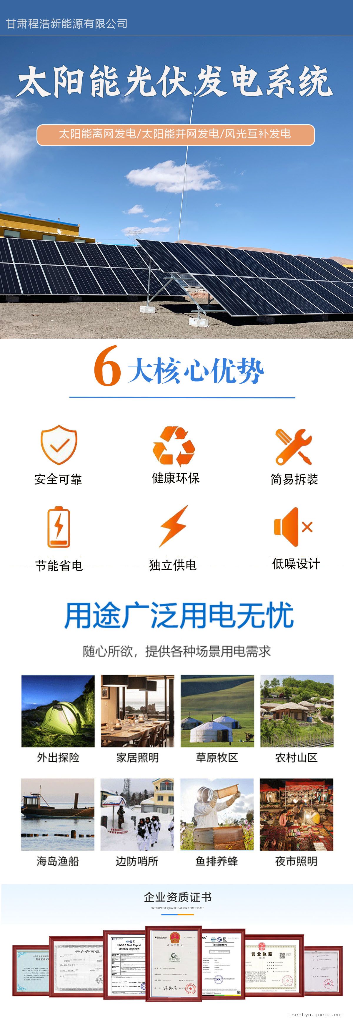 农业太阳能供电设备,带载能力:擦草机、粉碎机、拨玉米机、切割机、电冰箱、台钻、照明、电视、水泵等。性能特点: